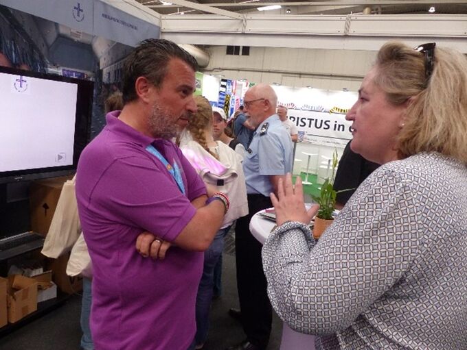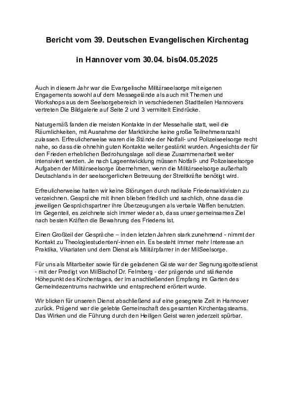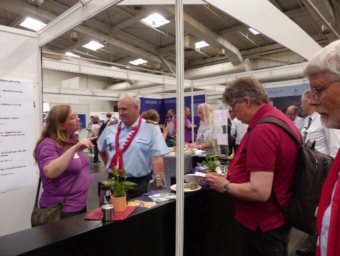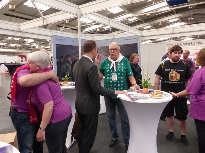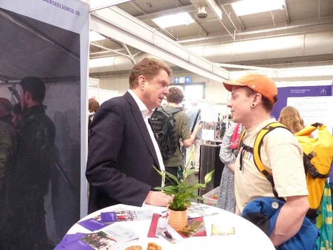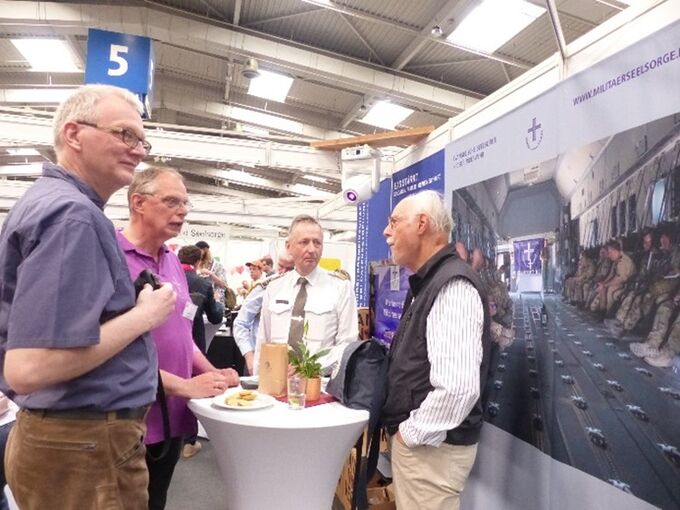 Naturgemäß fanden die meisten Kontakte in der Messehalle statt, weil die Räumlichkeiten, mit Ausnahme der Marktkirche keine große Teilnehmeranzahl zulassen. Erfreulicherweise waren die Stände der Notfall- und Polizeiseelsorge recht nahe, so dass die ohnehin guten Kontakte weiter gestärkt wurden. Angesichts der für den Frieden erheblichen Bedrohungslage soll diese Zusammenarbeit weiter intensiviert werden. Je nach Lageentwicklung müssen Notfall- und Polizeiseelsorge Aufgaben der Militärseelsorge übernehmen, wenn die Militärseelsorge außerhalb Deutschlands in der seelsorgerlichen Betreuung der Streitkräfte benötigt wird.